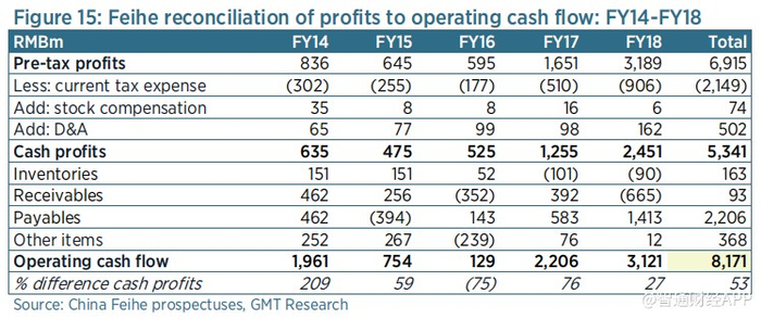 图15:飞鹤利润与经营现金流的核对:2014财年-2018财年