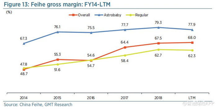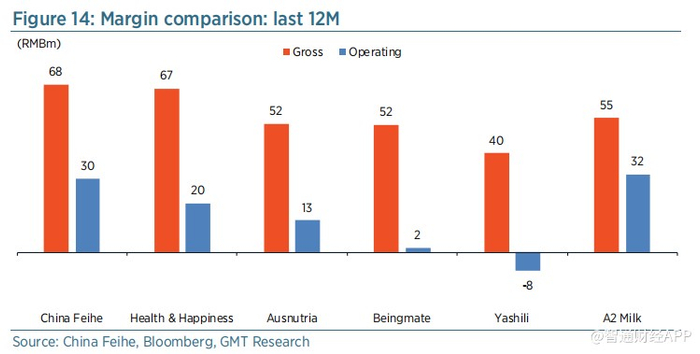 与中国同行相比,飞鹤的毛利率较高,但仅略高于H&H国际控股,后者2018财年的毛利率为67%,如图14所示。