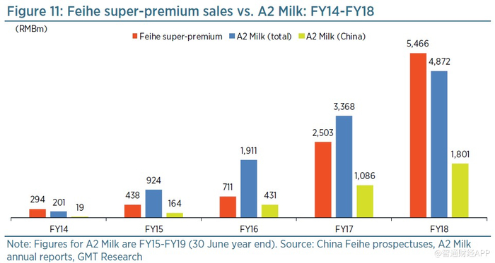 飞鹤的增长速度与来自澳大利亚的竞争对手A2 Milk相当,而后者主要通过直接或者个人代购进入中国市场。事实上,在过去几年里,飞鹤的销售额已经远远超过了A2牛奶的总销售额,如图11所示。