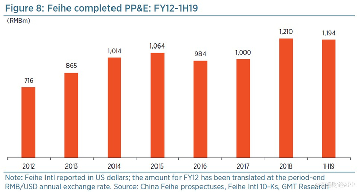 销量的小幅增长,可能就解释了为何除了加拿大的新工厂(下文将讨论)之外,飞鹤无需在资本支出方面投入大量资金。如图8所示,截至2013年12月,已完成的PP&E(固定资产)已从私有化前的约7.16亿元人民币,增至2019年上半年末的11.94亿元人民币,增幅达67%,远低于营收的增幅。