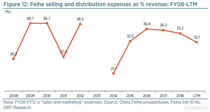从图12可以看出,在2014至2018财年期间,飞鹤的销售和分销费用大幅增加,2018财年占营收的35%。公司表示,费用增加的原因是更高的广告和促销费用。2019财年上半年销售和分销费用有所下降,这主要是由于广告支出的减少。它们在这种水平上是否可持续,仍有待观察。