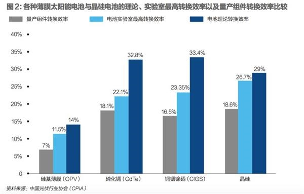 中国光伏行业协会2019年4月发布的报告指出,目前三大量产薄膜技术里,实验室里的电池最高转换效率为23.35%,由Solar Frontier公司于2019年1月创造。铜铟镓硒CIGS玻璃基组件的量产平均全面积转换效率为16%,柔性组件量产平均孔径面积转换率为16.5%。First Solar公司生产的碲化镉电池全面积量产组件平均效率为18.1%,实验室电池最高转换效率为22.1%。晶硅电池量产组件平均效率为18.6%,实验室最高转换效率为26.7%。