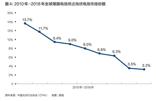但全球薄膜电池的产量在2016年达到4.9GW后,连续两年下降,2018年的产量为3.67GW。薄膜电池市场占有率正逐年降低,从2010年底的13.7%,降至2017年底的3.2%。在薄膜电池领域内,汉能所主推的铜铟镓硒电池份额也在缩小。2018年全球铜铟镓硒电池占薄膜电池总产量的比重为23.7%,其2016年的占比为30.6%。