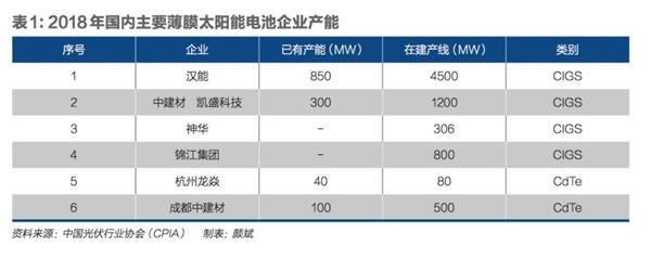 全球迄今最成功的薄膜太阳能公司美国First Solar公司,只生产碲化镉薄膜电池产品。First Solar预计其2019年的组件出货量约5.4GW至5.6GW,比2018年翻一番,其到2020年的订单已达11.3GW。