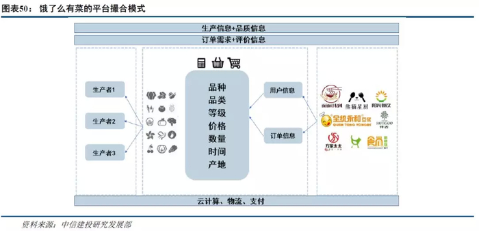 我们认为,平台模式提供的SKU零散化进货需求确实存在,物流、仓储和SKU分类将取代为中小商户提供少品类SKU的供应商,这是阿里利用电商逻辑切入食材供应链的机会。饿了么有菜虽然作为后进入者,利用阿里零售业务积累的线上线下能力或将助其拓展市场,通过线下推广和物流仓储能力吸纳更多生产者和餐饮商户进入交易平台。