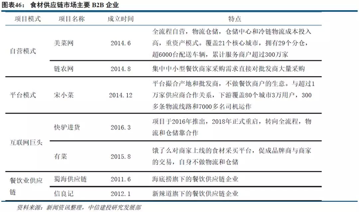 美团推出快驴进货意在深耕to B业务,饿了么有菜搭建平台延续阿里电商思维,快驴和有菜从物流和反向供应链突破。食材供应B2B兴起于2014年,行业历经多年的整合最终留下了美菜、宋小菜等B2B平台。从进入行业较早的美菜和宋小菜的经营模式来看,餐饮食材B2B有两大重点突破,一是以美菜为典型的仓储物流自建直连产地和终端模式,二是以宋小菜为代表的的反向供应链平台模式,由下游订单数据反向调整上游供应,实现产销平衡。快驴进货走的是美菜的运营模式,模式偏重;饿了么有菜学习宋小菜搭建平台,是阿里电商逻辑的延伸。