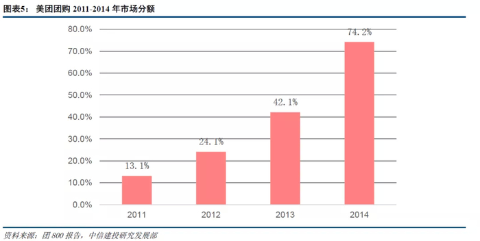 美团地推铁军继承了阿里铁人三项的精神,2011年底阿里第67号员工干嘉伟加盟美团担任COO,在千团大战关键时期为美团带来了阿里铁军成熟的团队管理。在干嘉伟加入后,美团地推团队发生了重要的战略改变,从一开始把流量灌到有限供给做爆单的营销路径战略转变成类似于电商路径的无限供给战略。而对于后者而言,通过增加商家拜访量这一基数来提升交易成交单量是最有效的途径。美团引进了较为完善的过程管理,将起初团购业务逻辑进行分解梳理,通过管理系统提取关键的过程指标,通过对过程的管控实现对结果的可控,例如地推人员每日走访顾客数量指标以及走访成功率指标。在进行这一战略转变之后,美团地推效果进步显著,在一年的时间内,市场分额从2011年13.1%逐渐增加到24.1%,成为千团大战的胜者。之后在2014年,团购的市场分额更是达到74.2%。