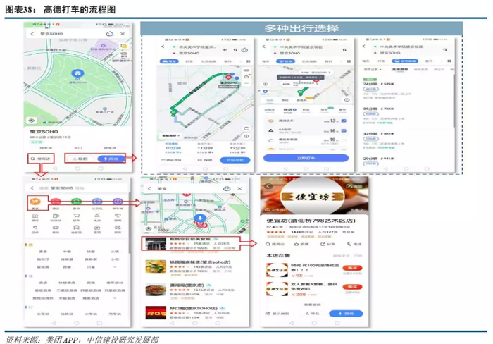 可以看出双方的优劣势都十分明显,美团在本地生活商家服务方面远远高于高德接入的口碑或者飞猪。在高德给出的周边美食中,可以团购的商户数量并不多。但是高德在出行方面给到消费者的不仅仅是打车,同时包括步行,地铁公交,驾车等,使出行过程组合更加丰富。此时,对于消费者而言,对两个平台的初始认知就很重要了,当消费者的目的是移动出行,很容易在第一时间打开高德地图,当消费者的目的是搜寻美食,就很容易打开美团。因此在接下来的竞争中,或许美团打车和高德打车的竞争重点在于提高打车业务体验的同时,提高用户本地生活业务的流畅度,更好地将出行和日常到店消费交叉融合,为整体生态提供更大贡献。