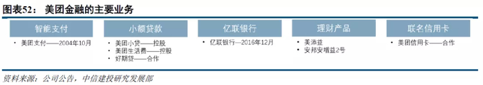 美团点评对应获得的相关牌照,先后开拓了基于各类资格的业务。形成了包括支付、贷款、网银、理财、信用卡等业务体系。其中小贷业务开展较为顺利,主要分为个人消费贷和商家生意贷两种。