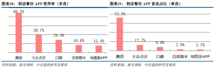依托于“百团大战”积累下的商户、用户规模,美团到店业务与阿里的口碑对比形成绝对优势。美团服务品类更全面、更细分、更下沉,各服务领域首选率最高。酒店及旅游业务各自扬长避短
