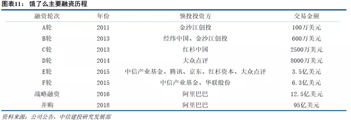 饿了么创立于2008年,从2011年开始融资历程高歌猛进,2015年估值超过30亿美元,2018年被阿里巴巴以95亿美元估值并购。