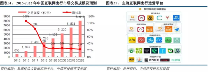 互联网市场规模增速稳定。中国互联网出行市场包括网约车(快车、专车)、出租车(APP端)、顺风车、租车(APP端租车、分时租赁)以及共享单车市场,根据易观数据,预计未来整体市场增速在未来五年内保持在25%以上,其中网约车业务因为占比最高同时发展迅速,成为了市场增长的最重要动力。
