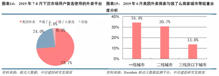 美团市场份额优势来自下沉市场,低线城市单平台用户更多。一二线城市外卖平台竞争趋于白热化,根据艾媒咨询,2018年中国外卖平台在一二线城市订单量分布几乎是饿了么和美团外卖平分天下:分别占47.4%和51.8%。真正拉开两者市场占比差距、形成“631”结构的是下沉市场的争夺。Trustdata移动大数据监测平台显示,三线及以下城市中双方平台商户重合显著少于一二线城市,证明低线城市更多商户为单平台商户,动摇较少,粘性较强,在低线城市美团的先发优势更加明显。