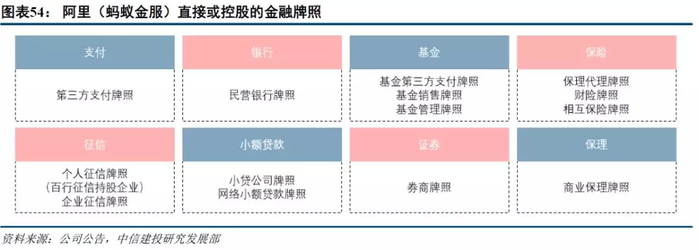 蚂蚁金服从支付平台转身成为互联网金融巨头。通过成立子公司申请或控股的方式获取牌照,目前已拥有14张金融牌照。阿里巴巴基于电商业务,以消费场景为基础,通过支付宝将消费数据与场景连接,进而构建商家和消费者信用体系,以开展针对小微企业和个人用户的金融业务。同时,阿里巴巴的助力也成为了蚂蚁金服的独特优势。