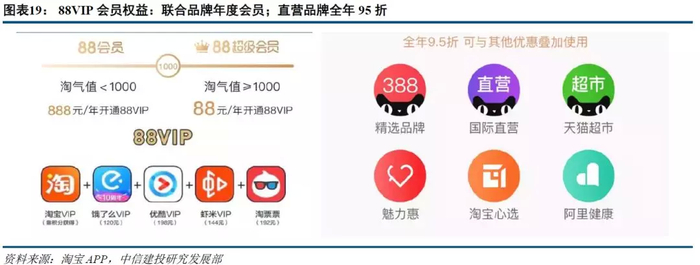 88VIP通过筛选淘气值在1000以上的用户并给予88元年度会员的折扣来迅速锁定摇摆用户,并通过联合会员的方式拉高用户在阿里生态内的复用、和交叉销售的效率。据阿里方强调,过去一年里每100个88VIP用户中就有38个新开通了优酷会员、有32个新开通饿了么会员、有27个新开通淘票票会员,88VIP对联合生态的会员带动效率十分高。随着互联网红利消耗殆尽,高质量用户的留存、复用成为核心盈利持续性的关键。