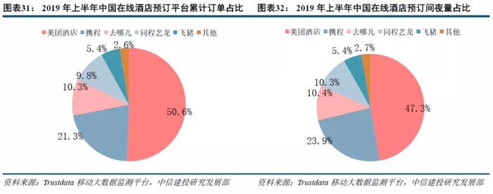 美团2013年开始布局酒旅,2018年超过携程间夜量成为业界第一酒店预订平台,2019年上半年包揽在线酒店预订订单的半数以上。不同于定位异地旅行服务的飞猪和携程,美团依附于平台已建立的本地生活服务网络,从本地即时性酒店、旅行需求入手,钟点房、低星酒店占比高,待规模扩大后再从低星酒店渗透高星酒店。