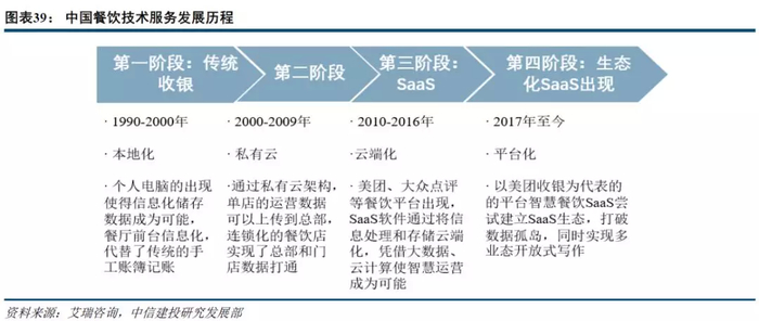 餐饮管理以收银为入口,在最近二十年里收银系统经历四次更迭。在第一阶段,收银系统实现信息化,用电子记账取代手工。在第二阶段互联网普及使收银机之间实现联网,实现店铺收银和总部系统之间的信息流通。第三阶段云服务开始应用于收银机,这一阶段出现客如云、二维火、哗啦啦等SaaS餐厅管理云服务提供商,通过绑定收银机为餐厅提供增值服务。在现阶段,美团点评和多数SaaS云服务提供商推出了“生态化”收银机,实现外卖、到店、营销、供应链等综合性SaaS云服务提供,线上线下全渠道数据打通,真正实现了餐厅实时在线。美团点评、饿了么口碑推出新模式,一方面赋能合作商户经营的方式,另一方面也提高商户对自家生态粘性从而加强平台核心竞争力。