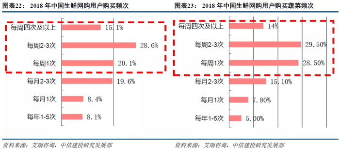 中国生鲜电商用户消费频次高:超6成生鲜网购用户每周购买一次。从消费端来看,中国消费者网购生鲜习惯已经养成,调研数据显示,每周购买一次的生鲜网购用户占比达63.8%,其中每周购买2-3次的用户占比为28.6%。从购买具体的生鲜品类上看,每周购买1次以上蔬菜的用户占比达72%,高于生鲜整体平均水平63.8%,蔬菜购买频次高于生鲜整体频次。
