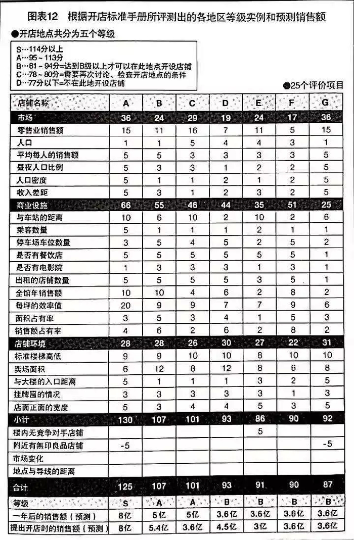 开店之前,调研人员需要根据手册中的项目对开店目的地进行逐一评分。最终无印良品结合总分和多次现场调查得到的信息,判断此处开店是否合理。