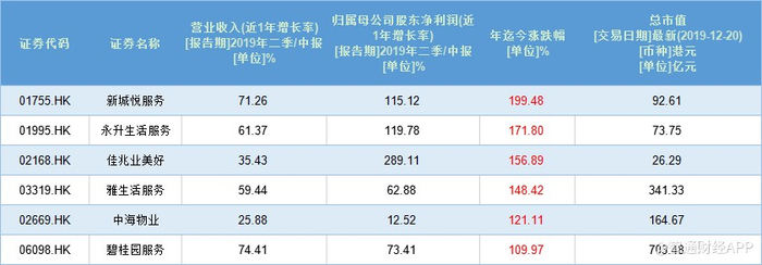 据智通财经了解,物业管理股之所以深受市场和投资者青睐,且翻倍股众多,主要是业绩表现靓丽。从营收来看,整个物业管理板块上市公司基本保持增长,如龙头碧桂园服务2019年中期营业收入与去年同期相比,增幅高达74.41%。从利润增速上来看,大部分物业管理板块上市公司都有着较强的增长,其中佳兆业美好的2019年中期的净利润增速高达289.11%。同时,物业管理股还具备轻资产、低负债、高现金流等特点,在估值上享有高于地产的溢价。