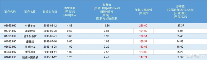 即便新股表现乏善可陈,但仍有个股实现翻倍。据智通财经统计,剔除创业板个股,今年以来,中烟香港(06055)、途屹控股(01701)、思考乐教育(01769)、康特隆(01912)、信基沙溪(03603)、优品360(02360)、瑞诚中国传媒(01640)7只新股累计涨幅超过100%。其中明星股中烟香港累计涨幅高达260%。