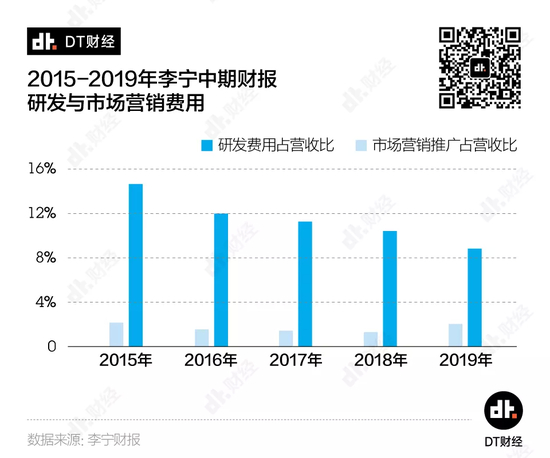 到2019年中,李宁的研发费用占营收比相较2018年其实已经上升了不少,代表对此的重视程度上升——虽然这个比例跟其他公司相比还是有不小差距。