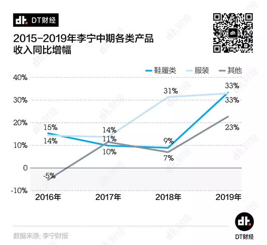 如果把李宁的收入进一步拆解,可以看到,2019年李宁获得较高的增长,来源于服装类稳住了2018年的增势,而鞋类在2019突然爆发。