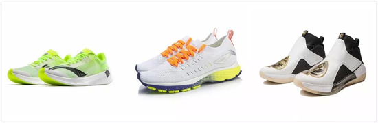 (图片说明:从左到右依次为李宁的䨻飞电系列的运动员版跑鞋、战斧系列男子跑鞋和驭帅12男子篮球鞋)
