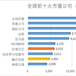 从全球主要上市公司来看,超过6000亿美元市值的公司只有7家,阿里位列第七,市值能占到石油巨擘沙特阿美的1/3,微软市值的1/2,比Facebook市值相当,比腾讯市值多出1000多亿美元。