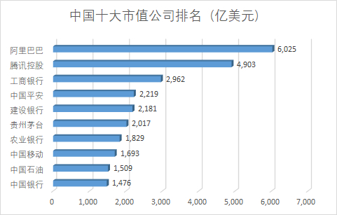 而阿里的6000亿美元市值,比腾讯控股市值多1000亿美元,相当于2个工商银行,3个贵州茅台,是第十大市值公司中国银行的4倍有余。
