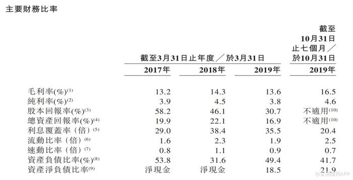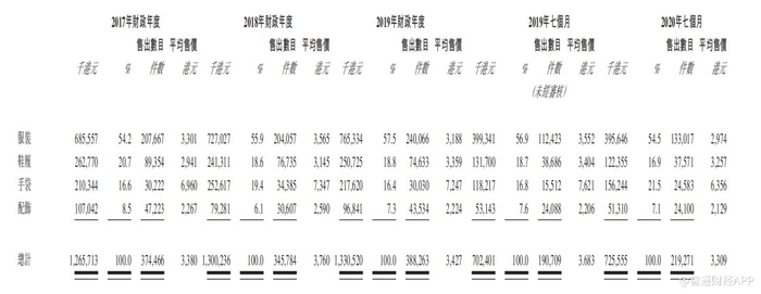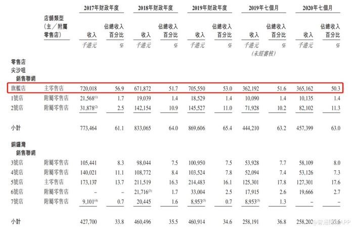 招股书显示,公司2017财年至2019财年的销售额分别达到12.66亿港元(单位下同)、13亿元和13.3亿元。于2019财年公司多家门店实现销售过亿,其中位于尖沙咀的旗舰店销售额达到7.06亿元。