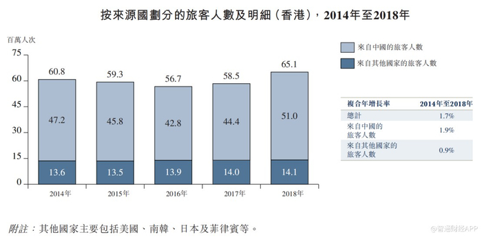 根据香港旅游发展局的资料,访港旅客总人数由2014年的6080万人次增长至2018年的6510万人次,复合年增长率为1.7%。随着高速铁路(香港段)及港珠澳大桥分别于2018年9月及2018年10月投入运作,2018年访港旅客同比实现14.9%的强劲增长。