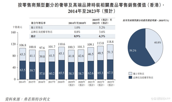 不过,据弗若斯特沙利文报告,长期来看,香港按零售商类型划分的奢华及高端品牌时装相关产品零售销售价值,未来仍将继续增长。2019年至2023年行业规模将由1003亿元增长至1188亿元,复合年增长率为4.3%。