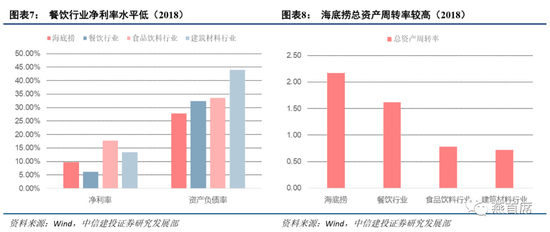 运营能力决定餐饮企业的ROE水平。与ROE水平较高的行业相比,餐饮行业的净利率水平较低,整体仅6.18%,与食品饮料、建筑材料行业的净利率水平有明显差距。考虑到杠杆水平过高会有较大风险,因此,餐饮行业提升ROE水平的主要方式是运营能力,也是海底捞实现高ROE的关键。尤其在海底捞的资产负债率降低后,整体的ROE水平更为健康,潜在的风险降低。