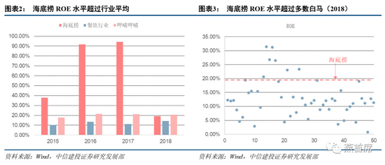 公司ROE水平及投资回收周期较优质。2015-2017年,海底捞整体ROE水平大幅领先餐饮行业平均水平,2016和2017年ROE水平均超过90%,2018年ROE出现下降也主要系大量新店开业所致,但与上证50指数的标的对比,仍处于较领先的位置;经测算,海底捞新店开业的一次性投入成本回收期约10-11个月,考虑新店开业的一次性成本等因素,新店开业基本可以保证在一年内贡献净利润。投资回收期短,使得海底捞即使在大规模开店的情况下,也能快速实现盈利,现金流充裕,盈利能力及成长性突出,展现优质资产极强的变现能力。