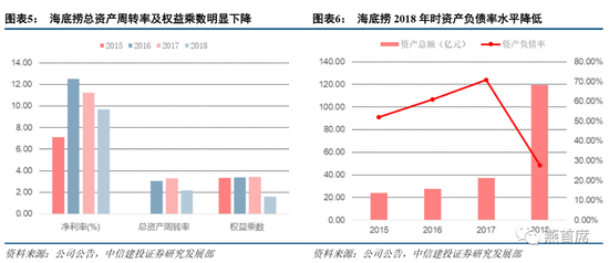 具体来看,影响海底捞ROE(摊薄)降低的主要是总资产周转率及权益乘数。从降幅来看,2018年时,海底捞的总资产周转率及权益乘数同比分别下降34.05%、52.93%,是ROE(摊薄)指标下降的主因。其中,总资产周转率下降主要是由于上市后资产总额大幅提升,而权益乘数下降则是由于公司整体负债水平降低。综合来看,公司的ROE(摊薄)的情况在向好发展。