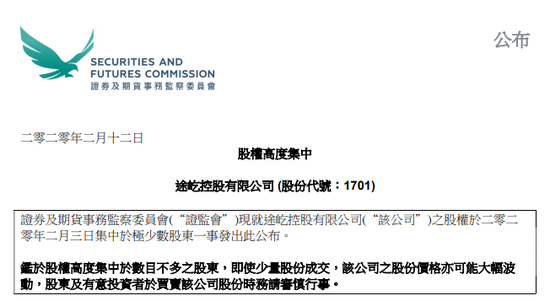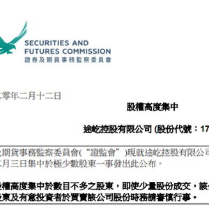 香港证监会公布,途屹控股(01701.HK)股权高度集中于数目不多的股东,即使少量股份成交,股价亦可能大幅波动,提醒股东及有意投资者审慎行事。