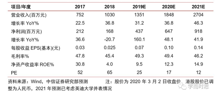 希望教育(01765)1.4亿美元收购马来西亚英迪大学。本次项目是公司首次海外收购。在进行海外布局的同时,公司积极发挥对内的协同作用,提高整体盈利能力。我们假设英迪项目2021年起正式并表,并结合银川、苏州学校的并表情况,上调2019/2020年净利润预测至4.37/6.47亿元,对应EPS预测为0.07/0.10元(原预测为0.07/0.08元),新增2021年净利润预测9.18亿元,对应EPS预测为0.14元,维持“买入”评级。