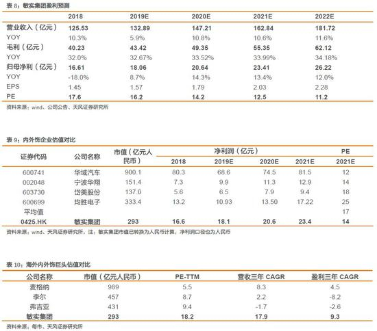 我们预计公司19-22年营收分别为133、147、163、182亿元,归母净利润分别为18、20.6、23.4、26.2亿元,对应PE分别为16x、14、13x、11x。由于港股没有同业务公司,我们选取A股和海外的内外饰企业进行估值对比。A股可比公司行业平均估值为17x,海外内外饰巨头平均PE-TTM为8x,但其复合增速远低于敏实。考虑到公司电池壳业绩规模打开后,收入占比有望达到30%,公司估值体系有望重塑,给予公司21年15倍PE,对应目标价30元人民币(对应港币34元),首次覆盖,给予公司“增持”评级。