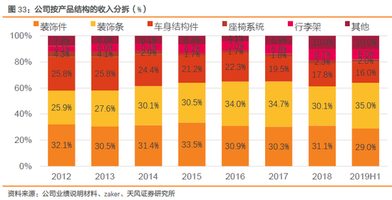 增加新产品,调整产品结构。 公司深耕汽车零部件领域多年,产品种类不断增加,1997年开展中国汽车外饰件业务,1999年开始生产车身结构件,2009年开展座椅骨架及排气管业务,2013年开始生产行李架,最终形成五大产品线。此后不断调整与优化产品结构,推出新产品扩大供应范围。
