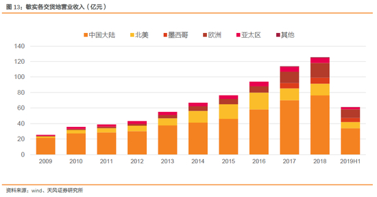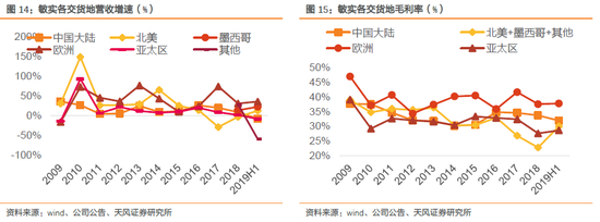 北美地区营收恢复。 2019年上半年,中国、亚太地区营收增速出现负增长,分别为-7.74%、-7.88%,欧洲地区营收持续高增长,同比增长35.81%,北美地区营收增速从18年-2.79%回升至12.86%,墨西哥营收加速增长,增速提至22.74%。各交货地区毛利率相对稳定,北美地区毛利率有明显提升,从18年22.76%增加至19H1的29.99%。