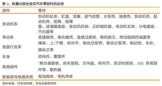 铝是应用最广泛的轻量化材料。减轻整车重量可以从采用轻量化材料入手,主要是铝合金、镁合金、碳纤维等。其中铝合金具有密度小(约是钢的1/3)、高热导率、耐腐蚀、性质安全等优良金属特性;且是地壳中含量最多的金属元素,回收率达80%,具有卓越的环保特性;与镁合金和碳纤维材料相比,铝合金的成本相对较低,技术相对成熟,最有可能实现规模化生产。铝是最早被用来替换钢材的材料,最初被用于动力总成周边件,如今应用范围逐渐扩大,变速器箱体、热交换系统的渗透率实现100%,发动机缸盖、车轮等应用程度也达到较高水平,未来进一步替换的重点将是车身、行李箱等零部件。对于新能源汽车,为了提升续航里程,将更大程度地采用铝合金来降低整车质量,如使用铝合金电池盒、铝车身、底盘等。