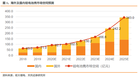 公司获得了欧洲大众MEB订单,配套大众所有B、C、D级电动车。至此电池壳客户遍及大众、宝马奔驰、沃尔沃、本田等德系、日系高端新能源车品牌,目前进展中的项目近20项,为全球最大的铝制电池盒供应商之一,公司铝电池盒业务“百亿”营收目标战略蓄势待发。我们预计2025年全球铝电池壳市场将达近350亿元,为公司后续拿订单提供充足市场空间。
