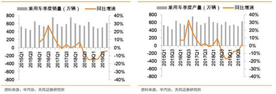 2019Q4乘用车产量回暖,增速同比转正。乘用车行业经过6季度持续负增长后,19Q3销量同比降幅开始收窄。乘用车产量在一年的去库存后,19Q3开始回升,19Q4首次出现正增长。目前行业库存处于近几年底部,有赖于政策和消费信心,我们预计2020年需求将逐步回暖,汽车主动加库存周期开启,零部件端有望受益。
