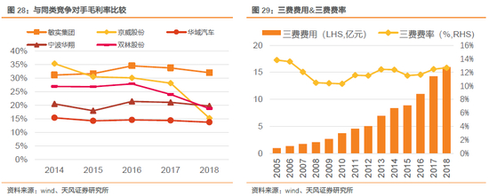 数十年精细化管理之路,提升成本控制能力。成本控制是公司数十年来坚守的一项重要品质,通过改进生产模式提高生产效率,纵向一体化整合产业链,自主研发模具和产品,提高生产自动化水平,毗邻客户设厂降低运输成本等措施,以发挥出成本控制优势。2014-2018年,与同行业竞争对手相比,敏实集团的毛利率始终处于较高水平,稳定在30%以上,保持显著竞争优势。