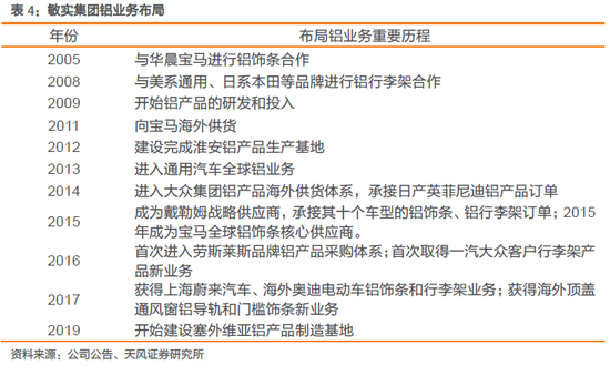 敏实集团积极布局铝业务,公司19年铝业务全球市占率约17%,预计2025年提升至33%。 敏实集团积极迎合汽车产品发展趋势,密切关注下游客户需求,为顺应主机轻量化趋势,2005年起布局铝业务,在电镀、阳极氧化和硬化涂层等表面处理技术方面取得领先突破,在2009年开始生产铝产品,目前涵盖铝饰条、铝行李架、铝门框、铝导轨和铝电池盒等产品。2012年建成江苏淮安铝产品生产基地,2016年海外铝产品生产基地投产,目前在淮安、嘉兴、墨西哥、德国等地设立了铝产品工厂;先后进入通用、宝马、戴勒姆、奥迪、大众铝产品全球配套体系。未来公司将形成中国、墨西哥、德国、塞尔维亚四大铝业务战略要地。
