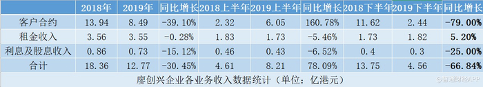 2019年上半年收入高速增长主要是因为客户合约收入同比大增160.78%,从而带动整体收入的提升。但至下半年时,客户合约收入增长“熄火”,且大幅下跌,同比下滑近80%。与此同时,利息及股息收入同比下滑25%。两大因素叠加导致下半年收入同比下滑66.84%。