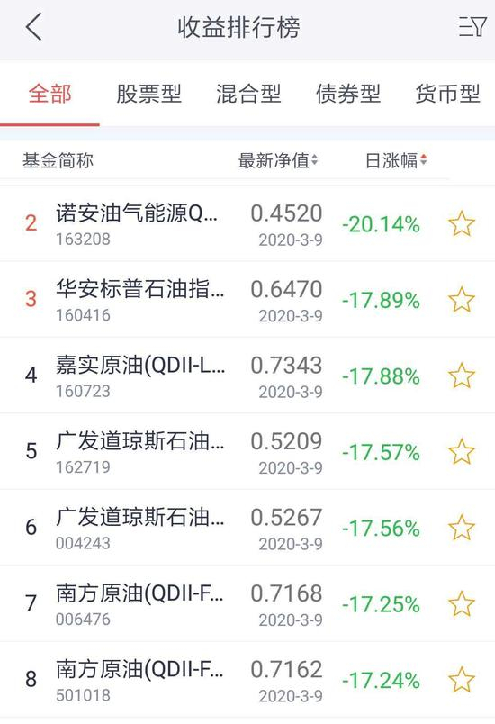 油气基金最新净值公布了,可谓一片惨烈!3月9日,华宝标普油气、诺安油气能源跌逾20%,华安标普石油指数、嘉实原油、广发道琼斯石油指数等均跌逾17%……