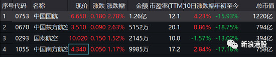 航空股昨日集体大涨5%左右,今日再度走高,中国国航、东方航空等涨近3%。