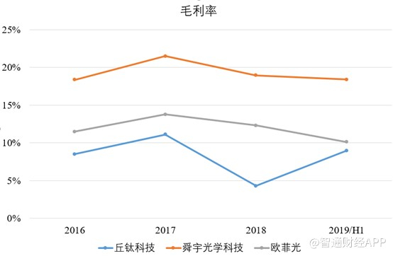智通财经观察到,2016年至2019年(全年/H1),舜宇光学科技(02382)毛利率约为19%左右,欧菲光近三年有所下滑,但也在10%以上,而丘钛科技只有2017年超过10%,在不具备龙头优势的情况下,想要进一步追赶,需要另辟蹊径。